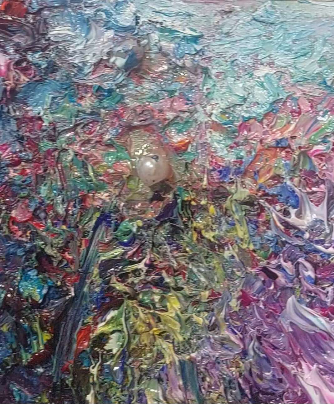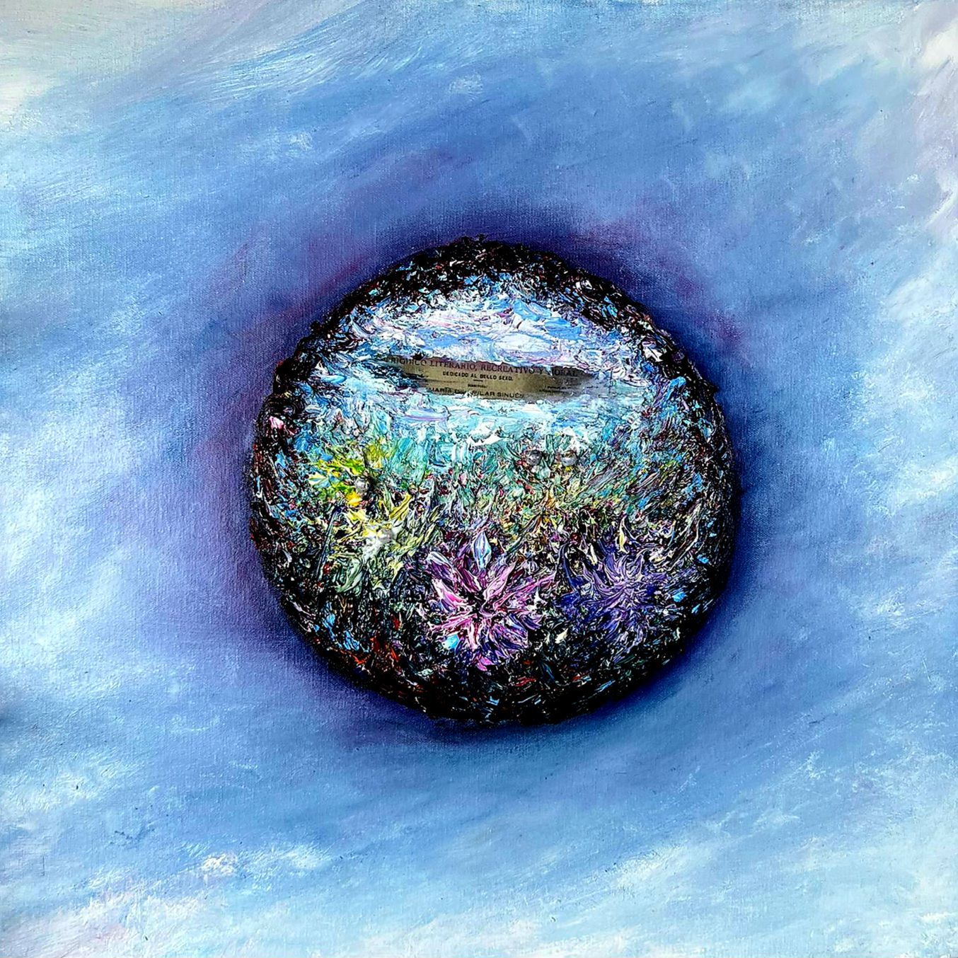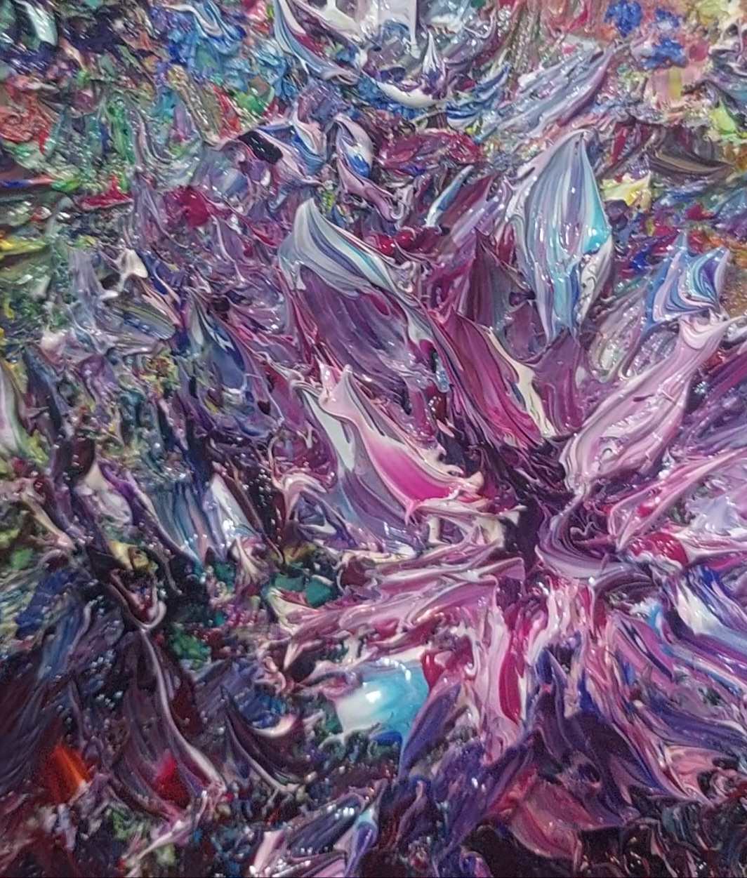 El círculo, inicialmente su espacio cerrado y protector, se convierte aquí también en límite y presión. En su perímetro exterior, las pinceladas densas y ásperas en tonos rojos carmín y oscuros construyen una superficie dura, casi agresiva, que simboliza la fractura de su mundo e idealización previa. Conforme nos desplazamos hacia el interior, entramos en riqueza simbólica más íntima y luminosa.