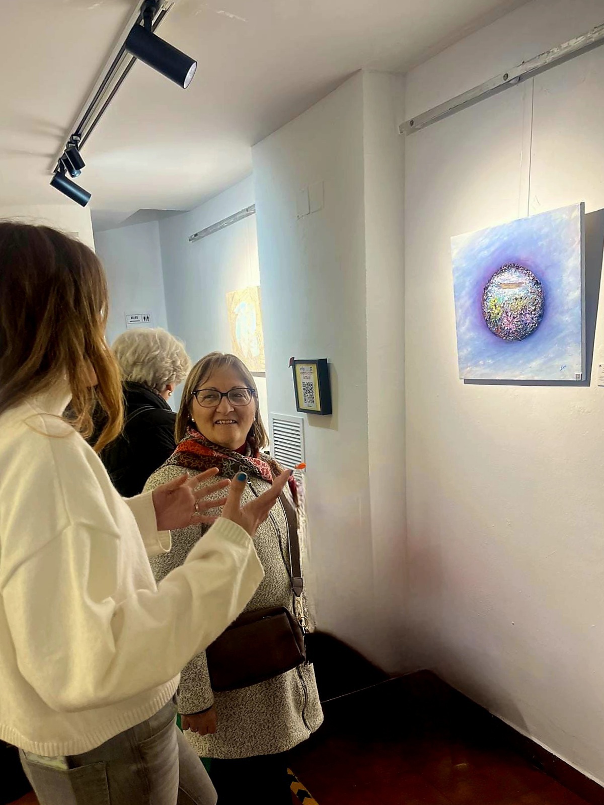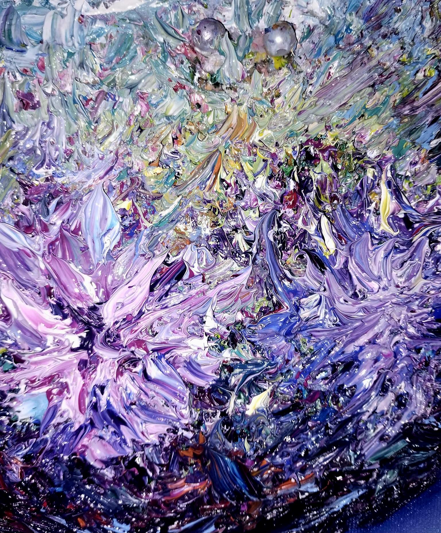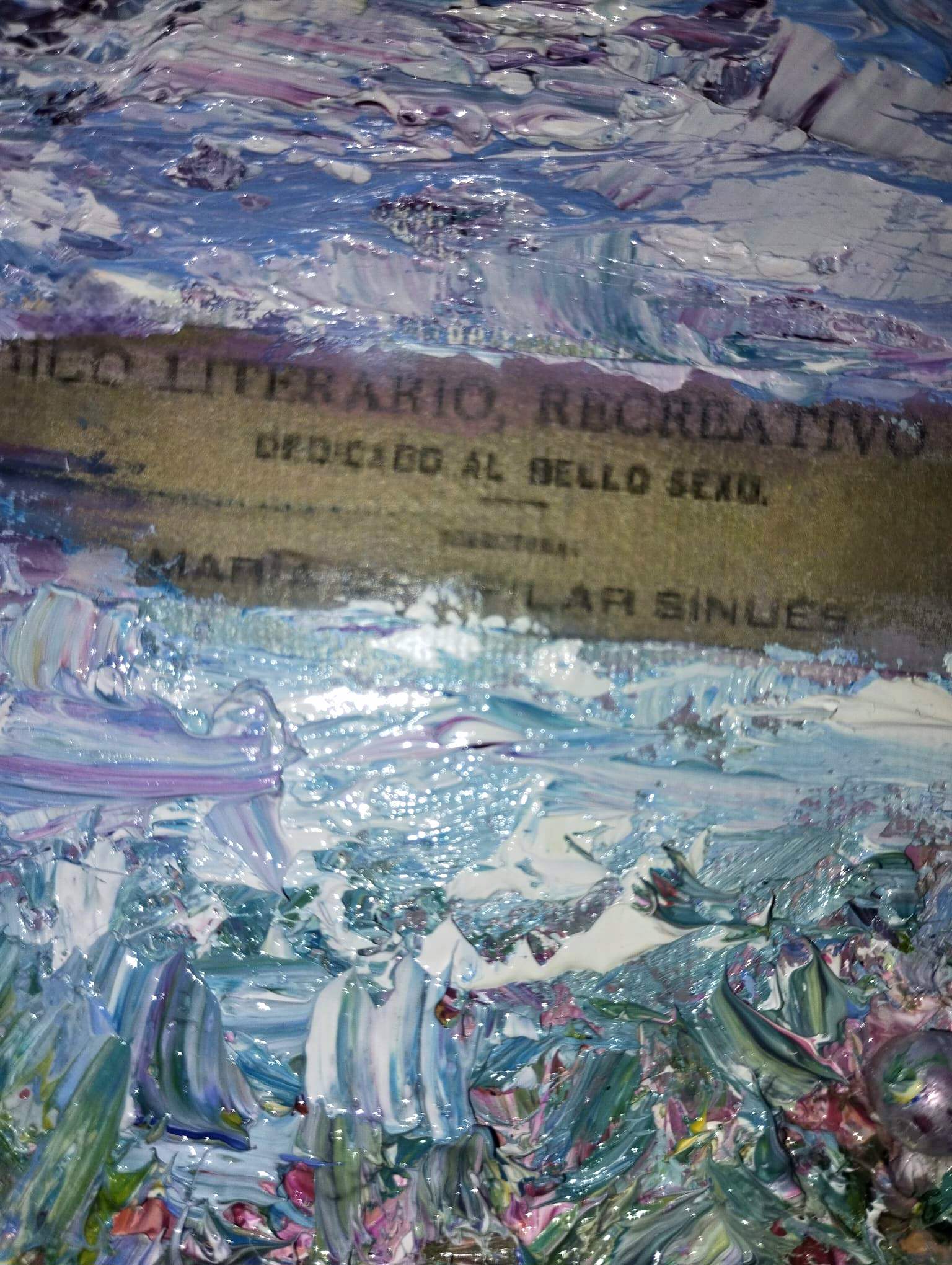 El círculo, inicialmente su espacio cerrado y protector, se convierte aquí también en límite y presión. En su perímetro exterior, las pinceladas densas y ásperas en tonos rojos carmín y oscuros construyen una superficie dura, casi agresiva, que simboliza la fractura de su mundo e idealización previa. Conforme nos desplazamos hacia el interior, entramos en riqueza simbólica más íntima y luminosa.