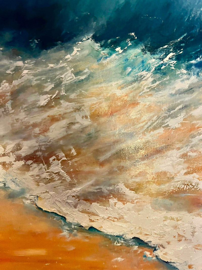 Dos obras de reciente creación, realizadas en óleo sobre lienzo. Ambas exploran la esencia del mar, desde una perspectiva de libertad y movimiento mediante pinceladas sueltas y enérgicas, uso espátula llena de carga y mis propios dedos para construir capas con diferentes texturas. (descripción)